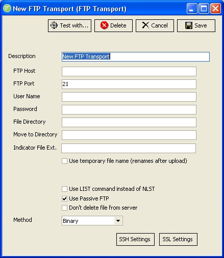 A FTP Transport is used to connect to a FTP service over the Internet or local network. You can send Files to the remote FTP service. You configure the FTP Transport with the appropriate details for connecting to the remote service and sending files.